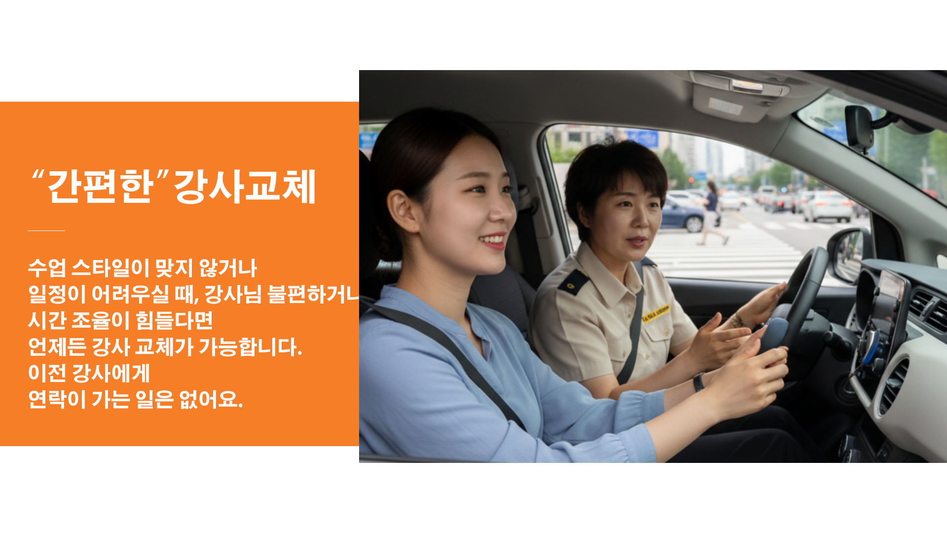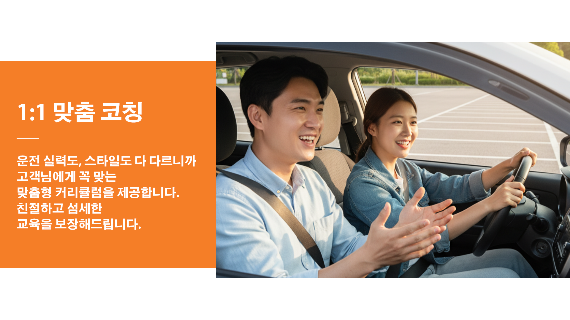 기본은 보조브레이크 장착 연수차이지만 자차 연수도 가능합니다. 자차로 진행할 경우 차량 상태와 보험 조건을 확인해야 해요.